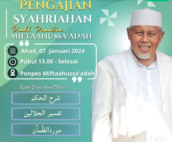 - 1 Desember 2024, Syahriahan di Pondok Pesantren Miftahaussa’adah Pimpinan Rois Syuriah PCNU Kota Sukabumi KH Abdullah Fauzi, Pengajian rutin ini selain mengkaji Kitab Al Hikam Juga mengkaji Kitab Tafsir Al Jalalain dan Kitab Kitab Mauridhu Dhom’an.