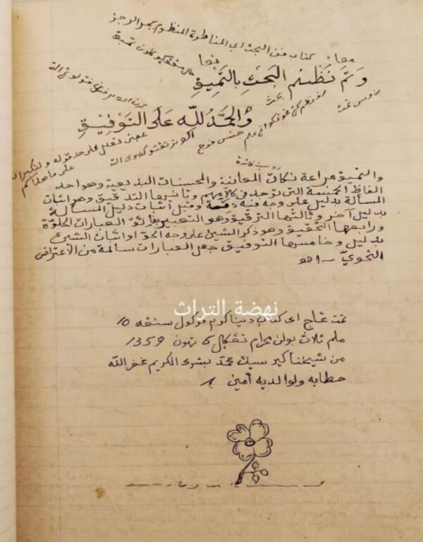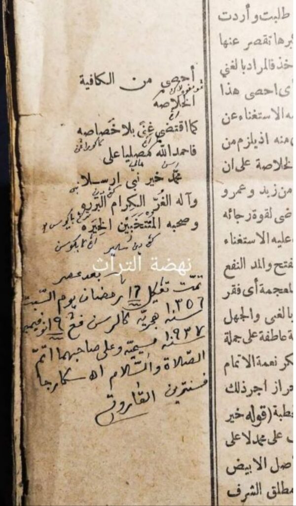 (Tamat ngaji ieu kitab dina kira-kira pukul satengah 10 / malem Salasa bulan Muharram tanggal 5 tahun 1359 / min syaikhinâ Keresek Muhammad Busyrol Karim / ghafarallâhu khathâyâhu wa li wâlidaihi âmîn [Selesai mengaji kitab ini pada kira-kira pukul setengah 10 / malam Selasa bulan Muharram tanggal 5 tahun 1359 / dari syaikhina Keresek Muhammad Busyrol Karim / semoga Allah mengampuni dosa-dosanya dan kedua orang tuanya. Amin]).
